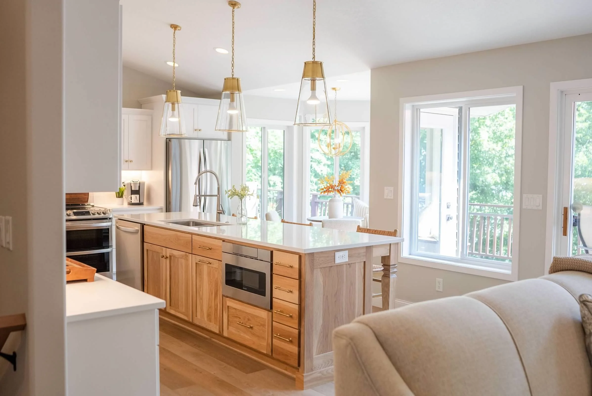 This main level renovation included updating flooring, millwork, railing, ceiling and wall paint. In addition, we incorporated several new built-ins and added a beautiful fireplace. The kitchen blends old and new cabinets with fresh paint and hardware.