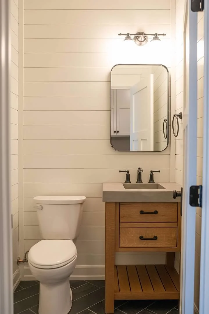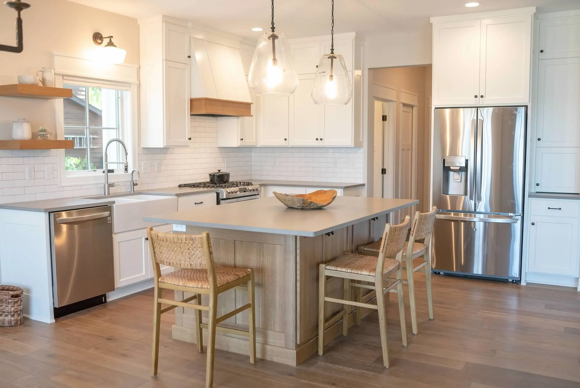 This beautiful home is located where an old cabin had been. That was torn down and a new cabin was built and attached to an existing garage. All selections were made together from the siding to the towel bars.